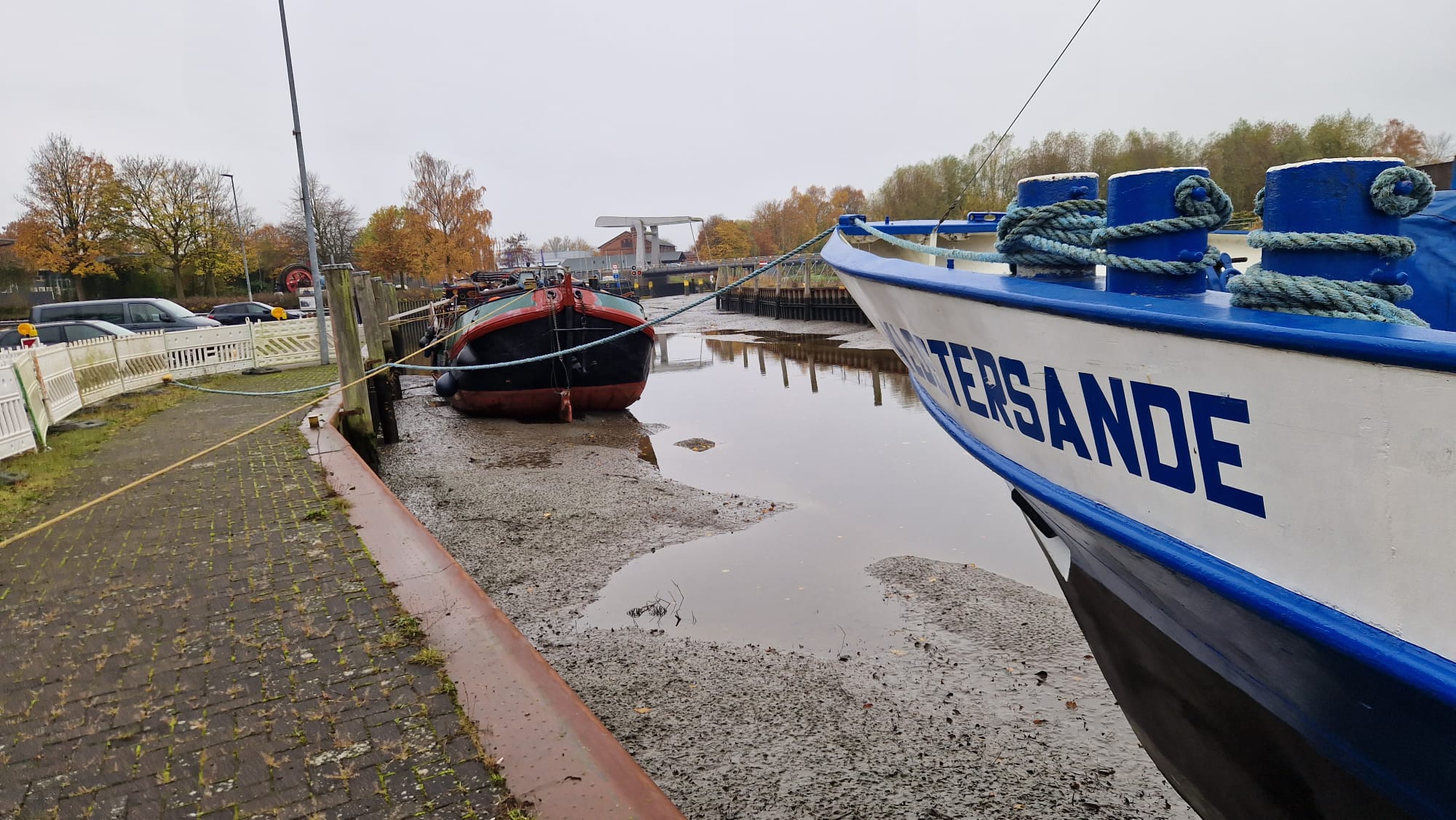 Jetzt müssen wir uns nur noch daran gewöhnen, dass das Schiff beim trockenfallen, schief im Schlick liegt. Aber vielleicht versuchen wir den noch mit Wasser etwas wegzuspülen. Dann müssen wir nicht mehr schräg im Schiff arbeiten.